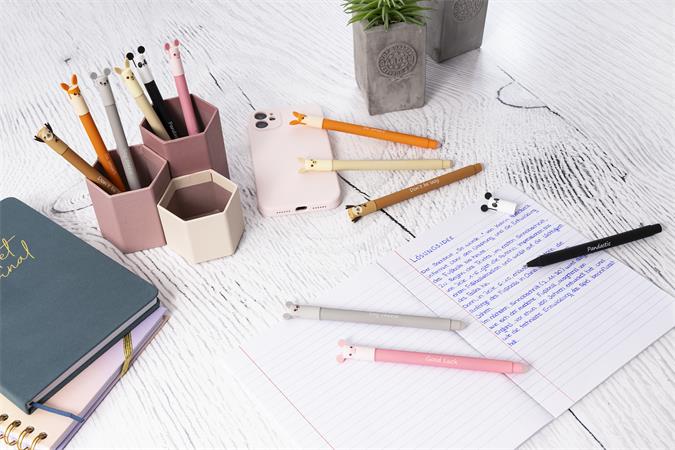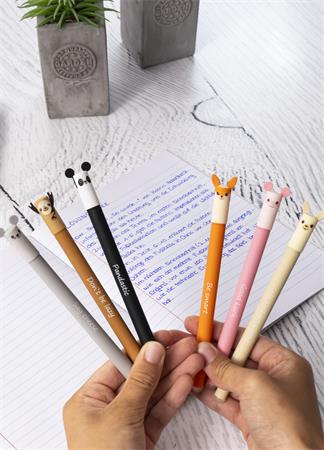 Zmazateľný Animal Erase it! - ideálne do školy, univerzity alebo kancelárie - gélový atrament - atrament možno ľahko zmazať plastovým hrotom na konci tela pera v dôsledku trenia - hrúbka písma: 0,7 mm - znovu naplniteľné - vtipné slogany na tele pera, ktoré zodpovedajú zvieracím motívom - vyhovuje smernici o hračkách (CE) - vymeniteľná modrá náplň: obj. kód: TFCE582153