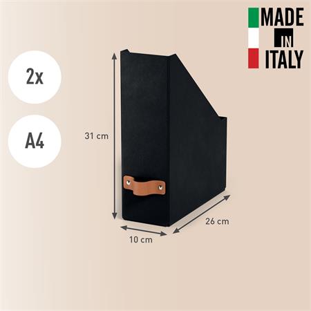 Súprava dvoch stojanov na časopisy zo 100% recyklovaného kartónu s certifikátom FSC s moderným a čistým dizajnom, ktorý doplní vašu domácnosť aj kanceláriu.Univerzálny úložný priestor s kapacitou 900 listov (80 g/m2) a otvorenou vrchnou časťou, ktorá umožňuje ľahký prístup k často používaným dokumentom, katalógom a písomnostiam vo formáte A4.Ideálne na ukladanie čohokoľvek od potrieb pre domácich majstrov a výtvarníkov, kníh a časopisov, až po lekárske dokumenty a účty doma, v práci či v škole.Pevný a odolný materiál spolu s dodatočným vystužením základne zabezpečuje, že stojan nepadá a zostáva vo vzpriamenej polohe.Na výber sú k dispozícii prírodné zemité farby s matným povrchom, ktoré môžete kombinovať a vytvoriť si tak moderný a organizovaný priestor.Štýlové kožené pútko uľahčuje vyberanie kartónových stojanov z políc či skríň.Perfektne sa hodia do nábytkových zostáv, policových modulov v tvare kocky, na police aj pracovné stoly.Dodáva sa zabalené v obale bez plastov, ľahko sa skladá bez použitia náradia.Možno 100% recyklovať jednoduchou demontážou na jednotlivé časti.Vysokokvalitné úložné stojany, vyrobené v Taliansku.CÍŤTE SA DOBRE so značkou Leitz