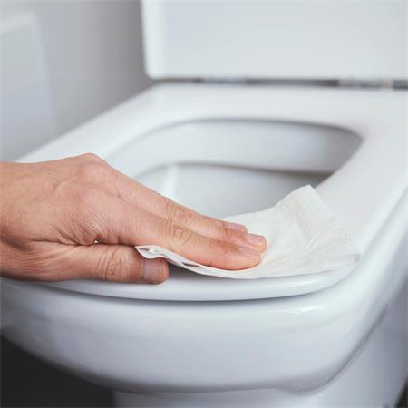 Čistič toaletných sedadiel Tork prináša pokoj návštevníkom toaliet. Toaletné sedadlo bude ešte čistejšie, ak ho utriete dávkou čističa na toaletné sedadlá aplikovaného na toaletný papier.